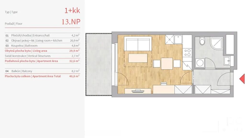 Byt tvoří světlý obývací pokoj s kuchyňským koutem, koupelna se sprchovým koutem a toaletou a vstupní chodba s místem pro vestavěné skříně.