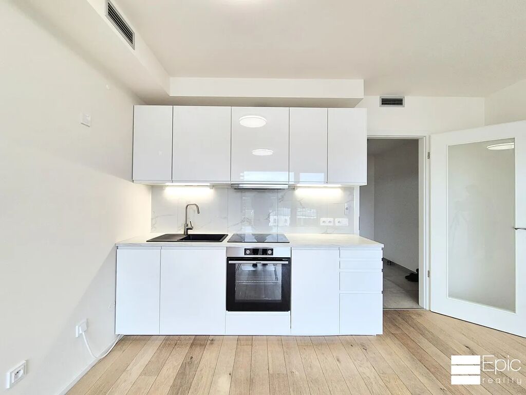 Kuchyňská linka je vybavena vestavěnými spotřebiči, v bytě jsou kvalitní podlahy a koupelna v moderním designu.