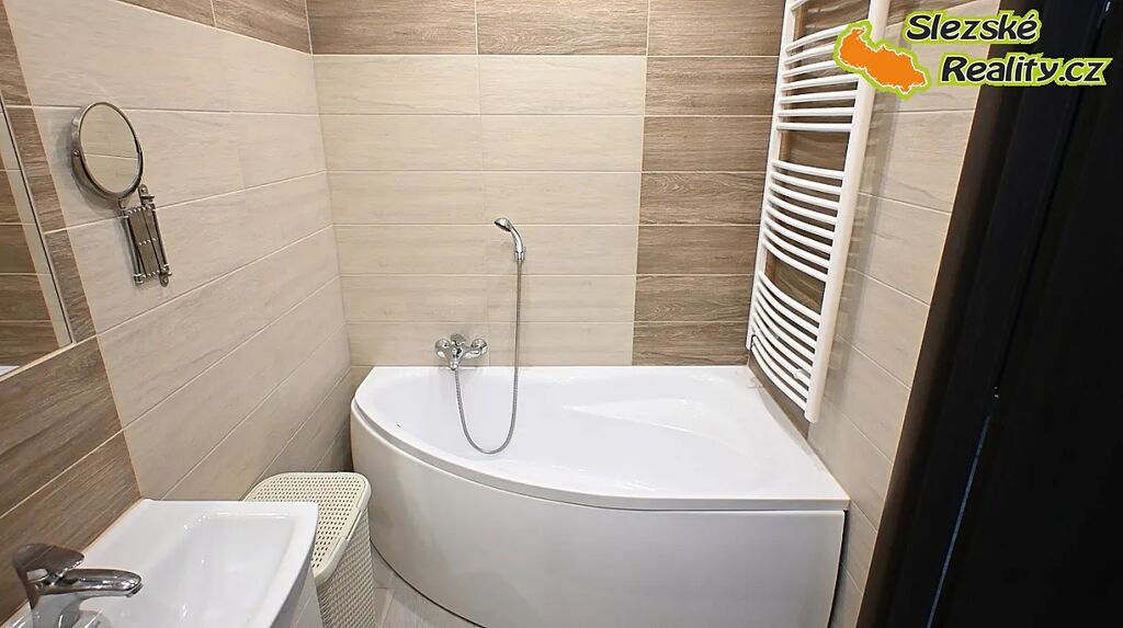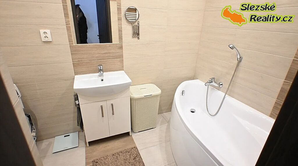 Koupelna je řešena novým bytovým jádrem s větráním a přístupem denního světla. Nachází se zde vana, toaleta je samostatná a laděná ve stejném stylu.