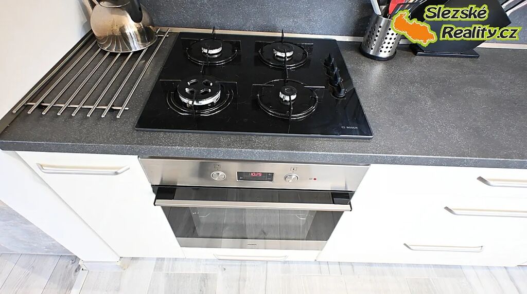 Srdcem bytu je moderní kuchyňská linka s kvalitním kováním Blum, vybavená vestavnými spotřebiči – sporákem, myčkou, lednicí a pračkou (umístěnou v koupelně).