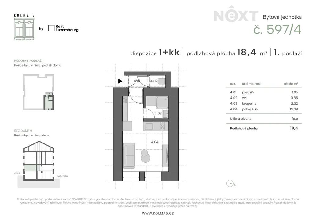 Tato konkrétní jednotka č.4 o dispozici 1kk a podlahové ploše 18,4 m2 se nachází v 1 nadzemním podlaží s výhledem do ulice. Je členěna na vstupní chodbu, oddělenou koupelnu a toaletu a obývací pokoj s kuchyňským koutem. Přesné rozložení si můžete prohlédnout na přiloženém půdorysu. Vytápění je řešeno elektrickými přímotopy a ohřev vody elektrickým bojlerem.