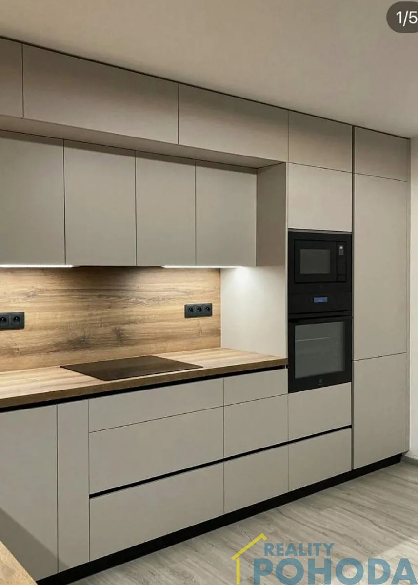Byt se skládá z prostorného obývacího pokoje s kuchyňským koutem, kde bude umístěná nová kuchyňská linka na míru včetně vestavěných spotřebičů jako je vestavěná trouba, sklokeramická varná deska, digestoř, myčka nádobí, kameninový dřez s baterií (fotka kuchyně je pouze ilustrační, kuchyň je již ve výrobě). V obývacím pokoji je krásné velké francouzské okno se vstupem na terasu a vlastní oplocenou zahrádku s výměrou 30 m2. Je to unikátní byt s vlastní zahrádkou, kde můžete trávit svůj volný čas a relaxovat po náročném dni.