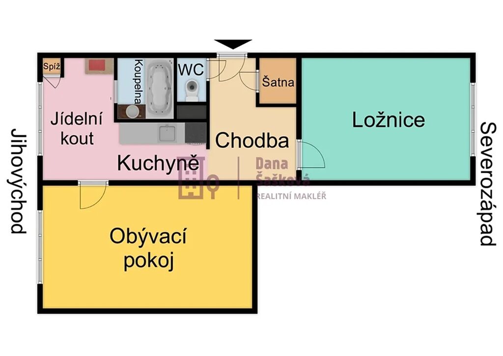 Dispozice 2+1 nabízí vstupní chodbu, šatnu, ložnici, obývací pokoj, kuchyni s jídelním koutem, koupelnu a samostatnou toaletu.