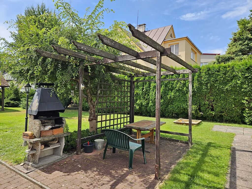 K bytu náleží zděná garáž s úložným prostorem v sedlové střeše nad garáží, samostatně stojící pergola s krbem, 2 odstavná parkovací místa u příjezdové cesty a pozemek zahrady o velikosti 132 m2 (94 m2 přední část, 38 m2 zadní část), na kterém je možno zbudovat pergolu, bazén anebo využívat pro zahradničení.