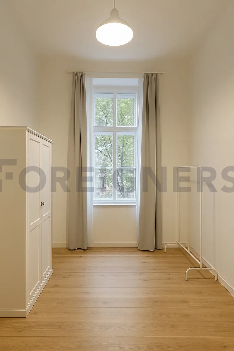 Do pokoje se vchází přes obývací pokoj s kuchyňským koutem a má okno směřující na západ do ulice.