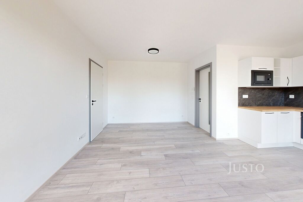 Dominantou bytu je světlý obývací pokoj s kuchyňským koutem o ploše 23,1 m² s přímým vstupem na terasu orientovanou na jih, odkud si můžete užívat příjemný výhled do zeleně. Kuchyňská linka je vybavena moderními spotřebiči – myčkou, elektrickou varnou deskou, troubou a mikrovlnnou troubou. Byt nabízí také samostatný pokoj (12,3 m²), vhodný jako ložnice nebo pracovna.