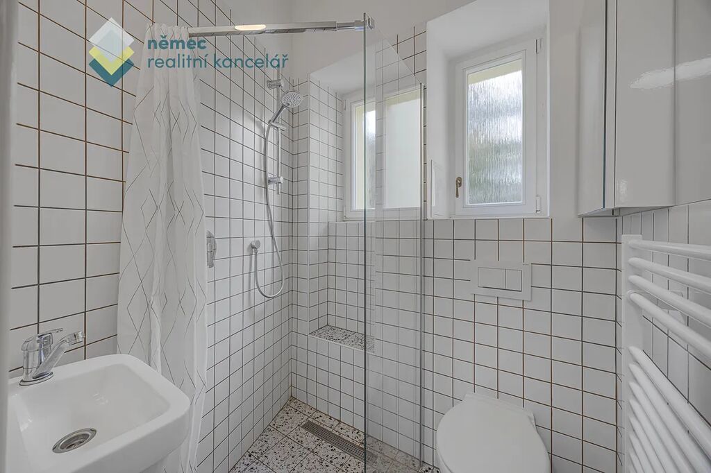 V koupelně najdete sprchový kout, WC a je k dispozici topný žebřík na ručníky.