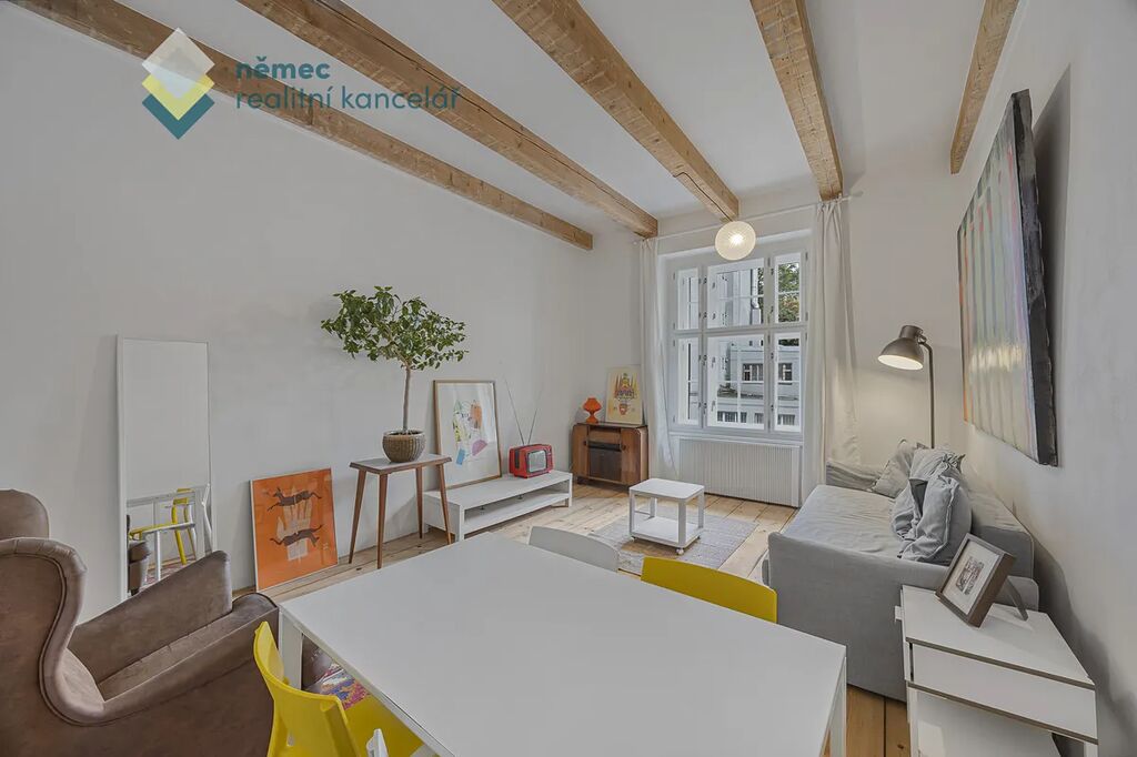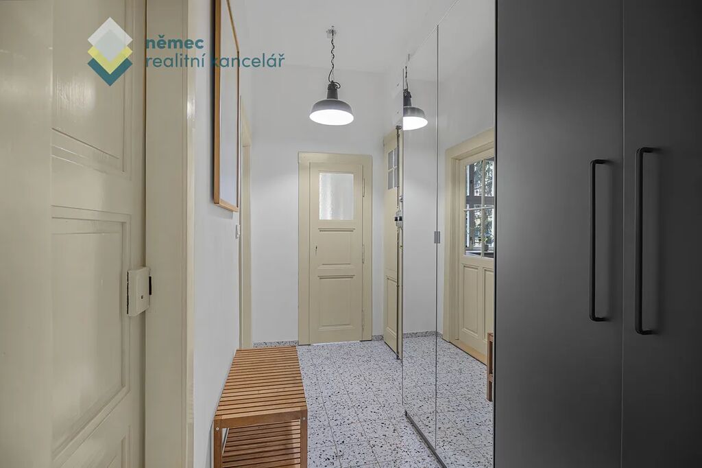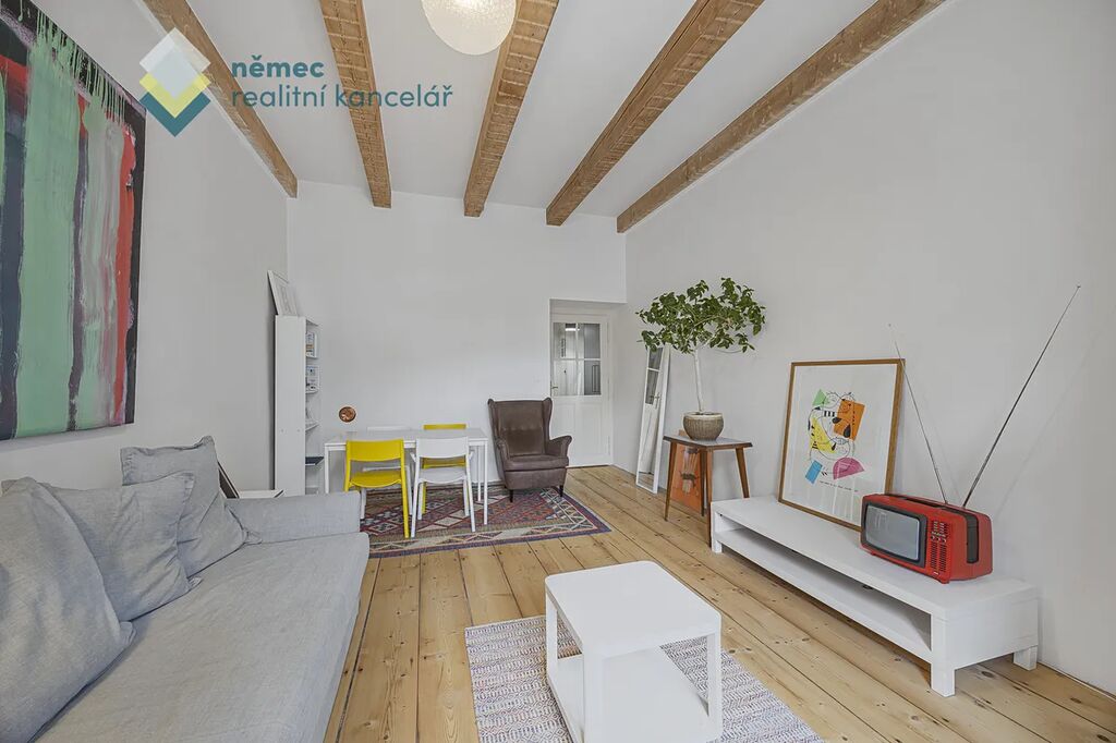 Světlý a citlivě renovovaný byt s přihlédnutím na přírodní materiály a okny jak do vnitrobloku, tak do klidné ulice je kompletně zařízen nábytkem.