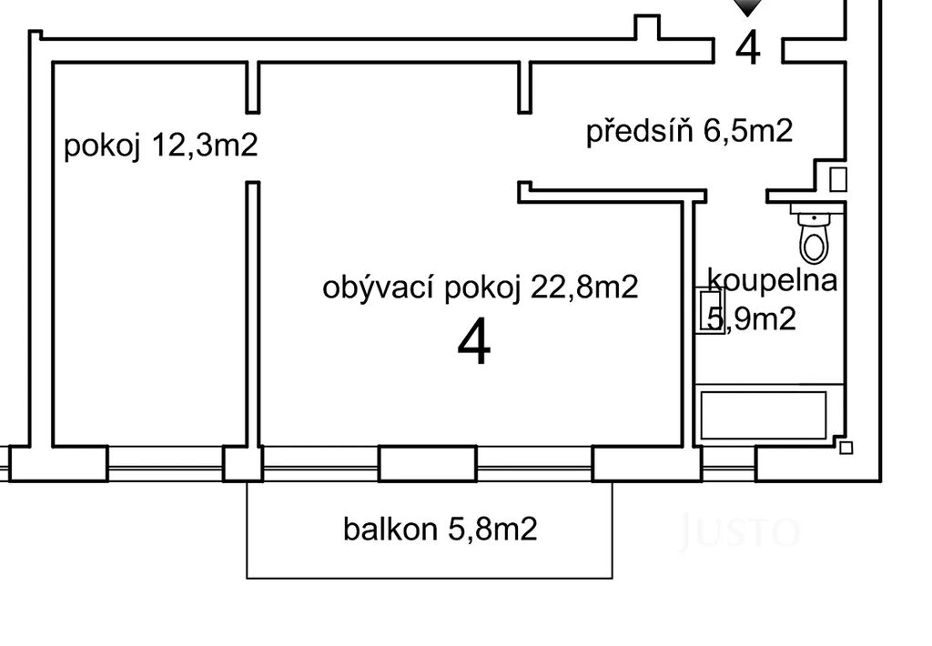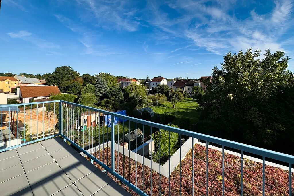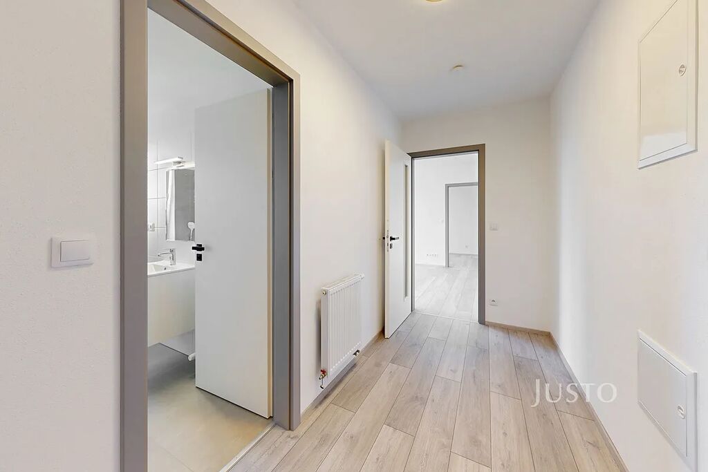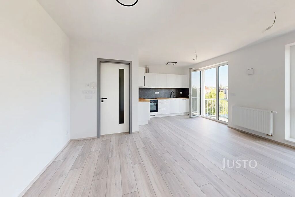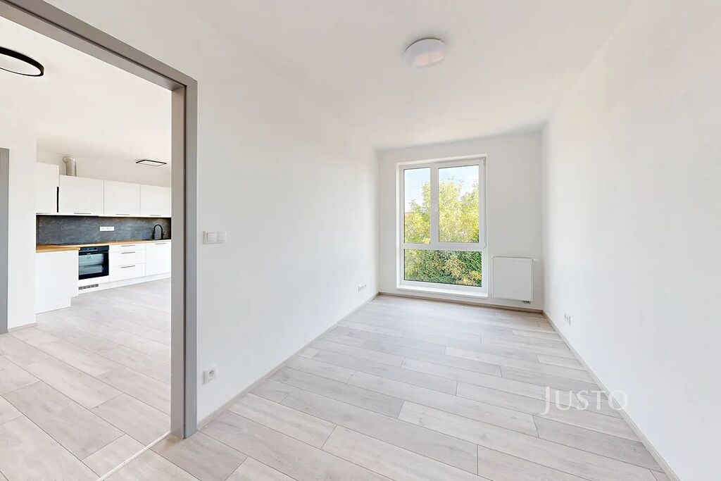 Dominantou bytu je světlý obývací pokoj s kuchyňským koutem o ploše 22,8 m² s přímým vstupem na balkon orientovanou na jih, odkud si můžete užívat příjemný výhled do zeleně. Kuchyňská linka je vybavena moderními spotřebiči – myčkou, elektrickou varnou deskou, troubou a mikrovlnnou troubou. Byt nabízí také samostatný pokoj (12,3 m²), vhodný jako ložnice nebo pracovna.