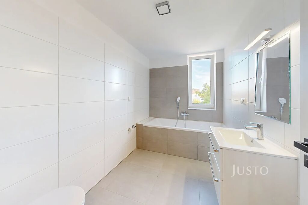 V koupelně najdete vanu, umyvadlo, WC a prostor pro pračku, vše v nadčasovém a elegantním provedení. V bytě jsou plastová okna, kvalitní podlahy a ústřední plynové vytápění s radiátory. K bytu náleží sklep (1 m²) a vlastní garážové parkovací stání přímo v domě.