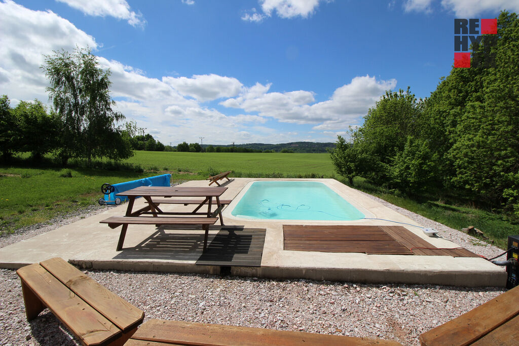 Na profesionálně udržované zahradě se nachází pergola, zahradní domek s ohništěm, bazén 6 x 3 m, terasa s posezením u jezírka, garáž, přístřešek pro auta a dostatek prostoru pro parkování.