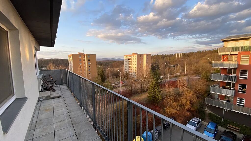 Tento moderní zděný byt je situovaný v 5.NP, je orientovaný na severovýchod s krásným výhledem do přírody, k dispozici je nestandartně velká terasa ( 13 m2), vysoký zděný sklep ( 4m2) v suterénu domu a k dispozici je i parkovací stání pod domem, které je stejně jako sklep, přístupné výtahem přímo k bytu. Bydlení je tak zcela bezbariérové.