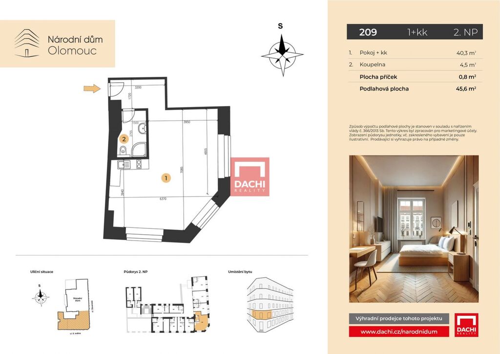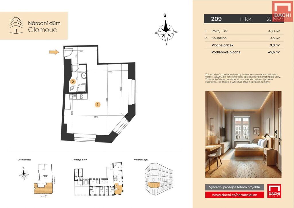 V rámci projektu nabízíme byt č. 209 o dispozici 1+kk s podlahovou plochou 45,6m, který se nachází ve 2. nadzemním podlaží.