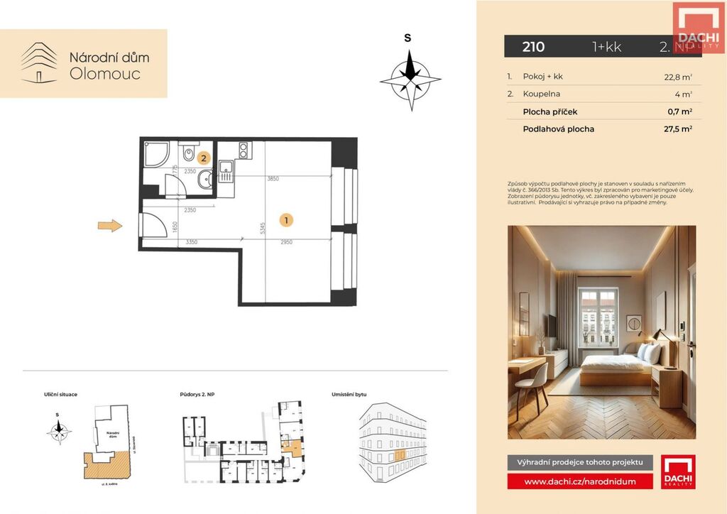 V rámci projektu nabízíme byt č. 210 o dispozici 1+kk s podlahovou plochou 27,5m, který se nachází ve 2. nadzemním podlaží.