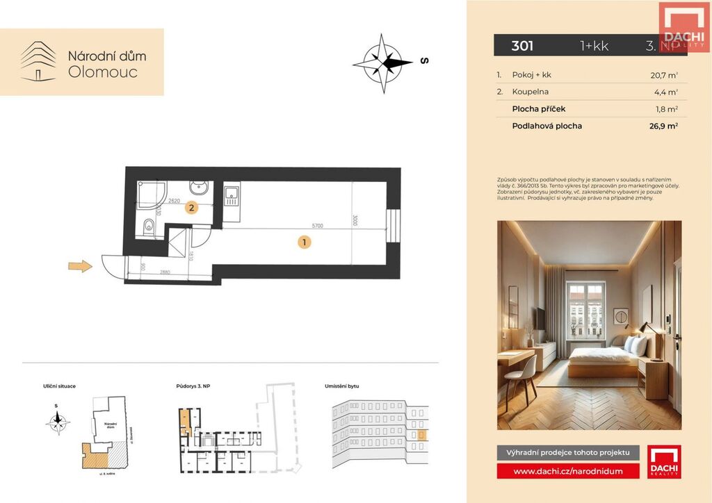 V rámci projektu nabízíme byt č. 301 o dispozici 1+kk s podlahovou plochou 26,9 m, který se nachází ve 3. nadzemním podlaží.