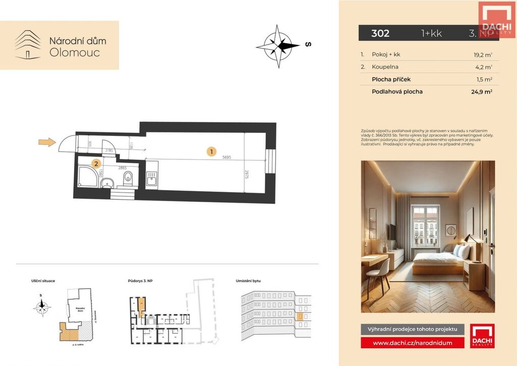 V rámci projektu nabízíme byt č. 302 o dispozici 1+kk s podlahovou plochou 24,9 m, který se nachází ve 3. nadzemním podlaží.