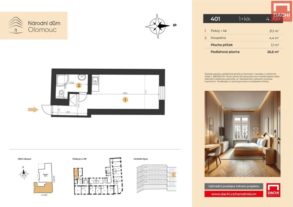 V rámci projektu nabízíme byt č. 401 o dispozici 1+kk s podlahovou plochou 26,6 m, který se nachází ve 4. nadzemním podlaží.