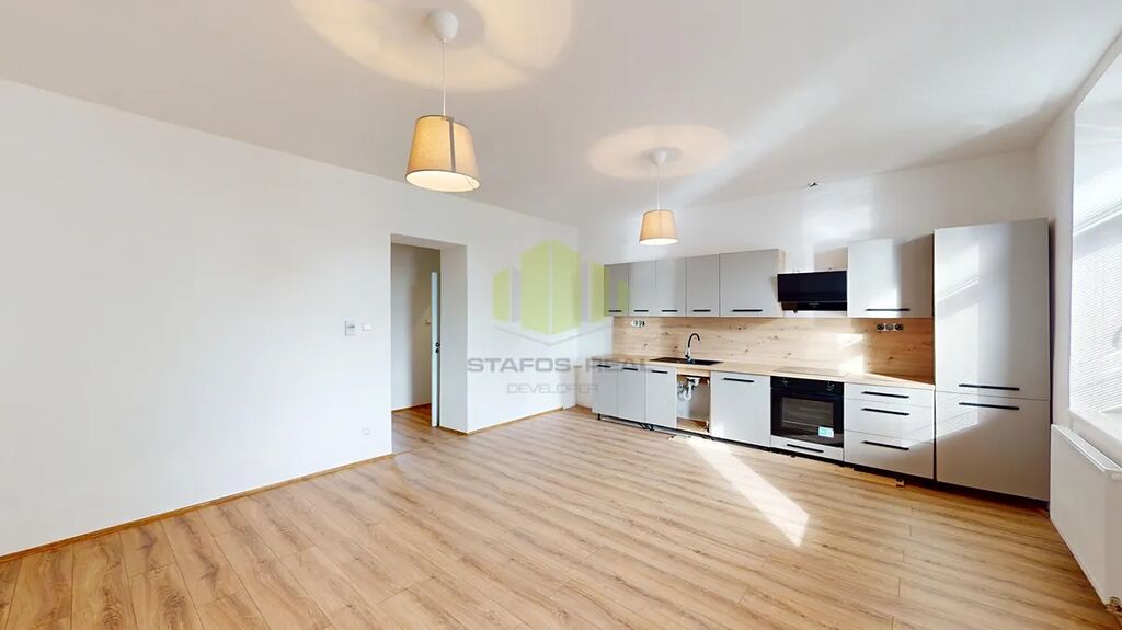 Dispozici bytu tvoří vstupní chodba, koupelna s bezbariérovým sprchovým koutem typu walk-in a toaletou, technická komora s plynovým kotlem a přípravou na pračku a sušičku, ložnice orientovaná na sever do klidného vnitrobloku rodinných domů a obývací pokoj s kuchyňským koutem orientovaný na jih do ulice. Kuchyňská linka je vybavena varnou deskou, troubou a dřezem; lednice není součástí. Po domluvě je možné doplnit myčku nádobí s finanční participací nájemce.