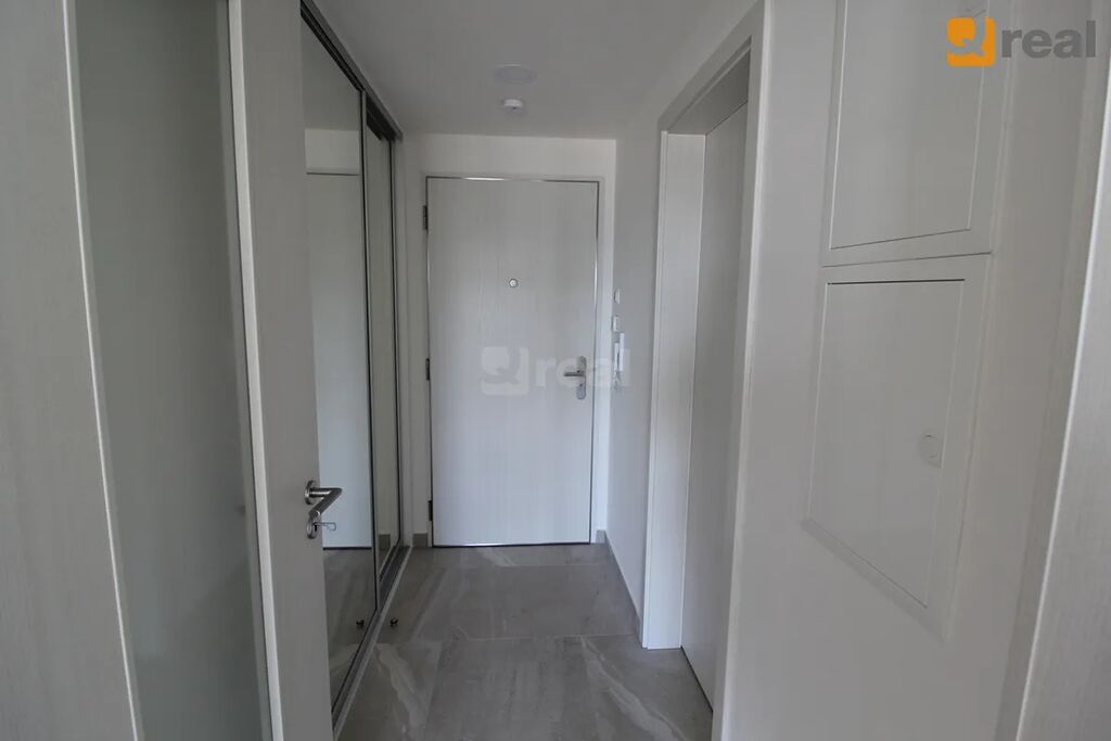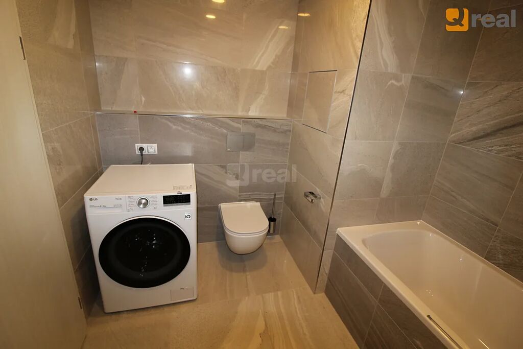 Byt 2+kk 51m2 je vybaven elektrickými žaluziemi s časovým ovládáním, situován ve 4.patře domu se dvěma výtahy. V bytě je moderní kuchyňská linka s indukční varnou deskou, elektrickou a mikrovlnou troubou, myčkou, vestavnou lednicí s mrazákem. Koupelna je s vanou, WC, skleněnou zástěnou, pračkou s integrovanou sušičkou, kosmetickou galérkou, skříňkou s umyvadlem a podlahovým topením. V celém bytě je již nainstalováno osvětlení.
