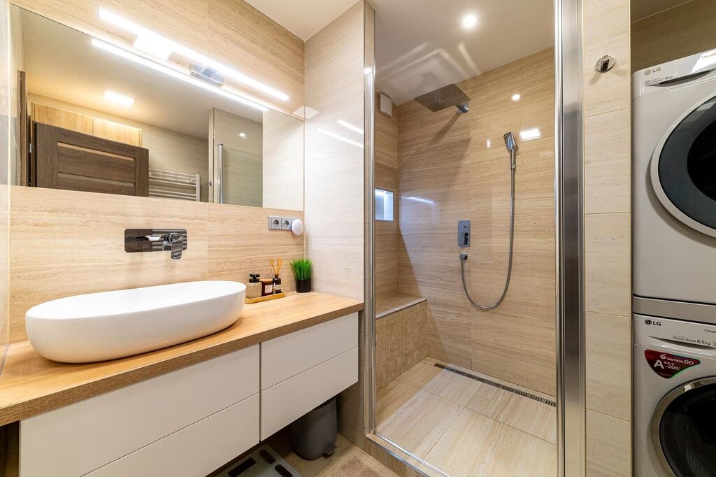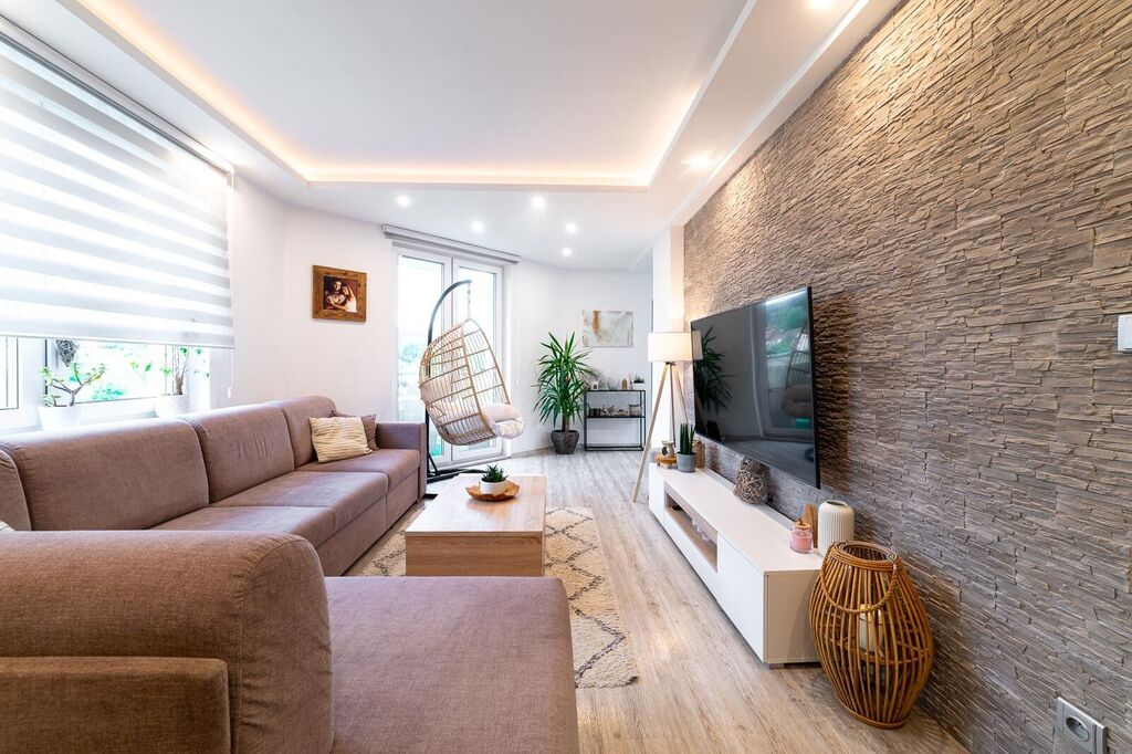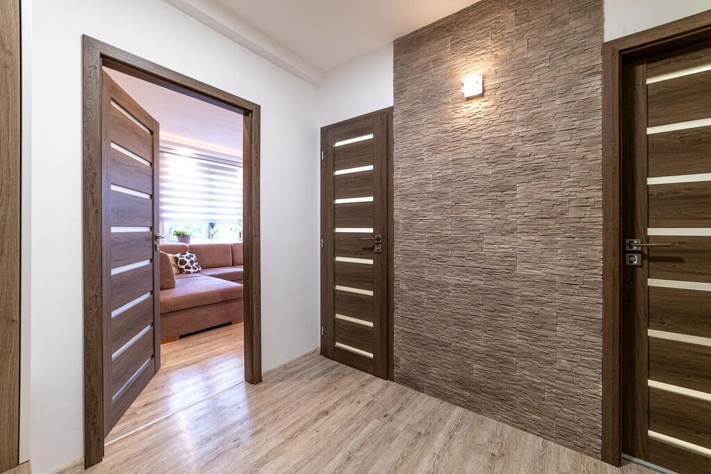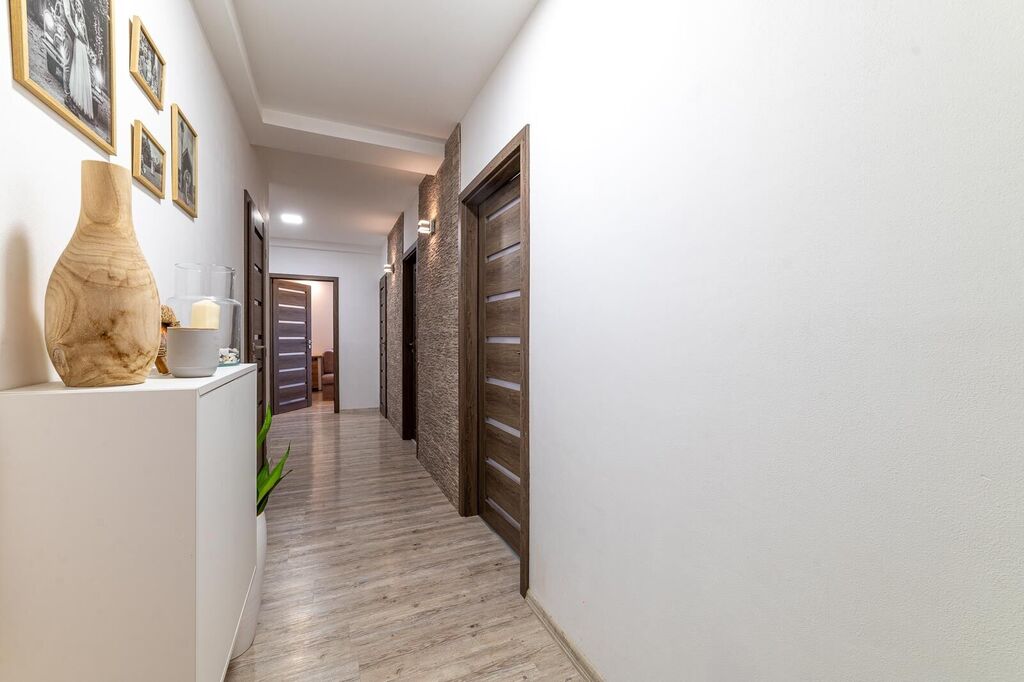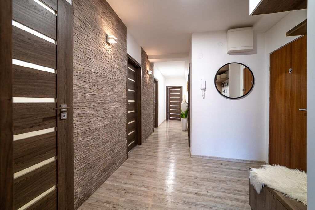 Byt vás přivítá světlým a elegantním interiérem, kde dominuje kvalitní laminátová podlaha v obytných místnostech a keramická dlažba v koupelně i prostorném sprchovém koutě. Celkový dojem dotváří kameninový dekorační obklad na chodbě i částečně v obývacím pokoji, který prostoru dodává moderní a nadčasový charakter.
