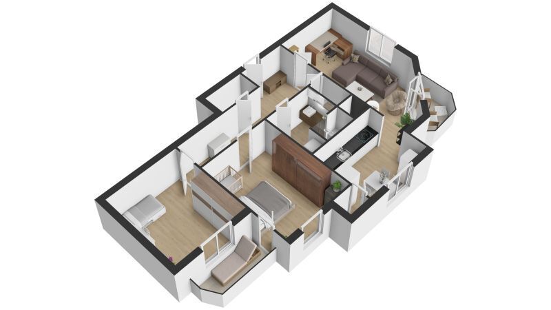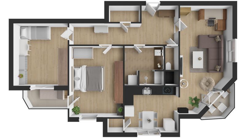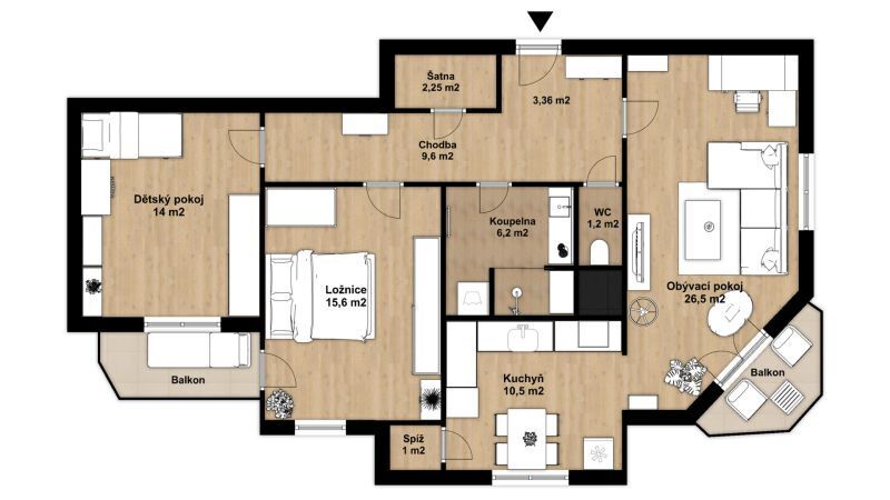 Velkým benefitem bytu je promyšlené dispoziční řešení – prostorná kuchyň je chytře oddělená od obývacího pokoje, což vytváří ideální kombinaci místa na vaření i soukromí. Z obývacího pokoje je vstup na první balkon, ze kterého je moc pěkný výhled, zatímco druhý balkon je přístupný přímo z ložnice. Obě ložnice v bytě jsou neprůchozí, což zaručuje klid a dostatek soukromí pro všechny členy domácnosti. 100% využijete velkou šatnu, kam schováte veškeré svoje boty a oblečení.