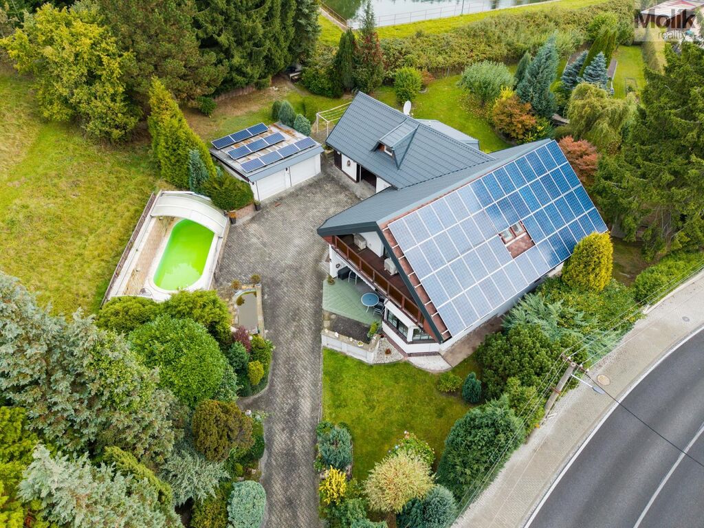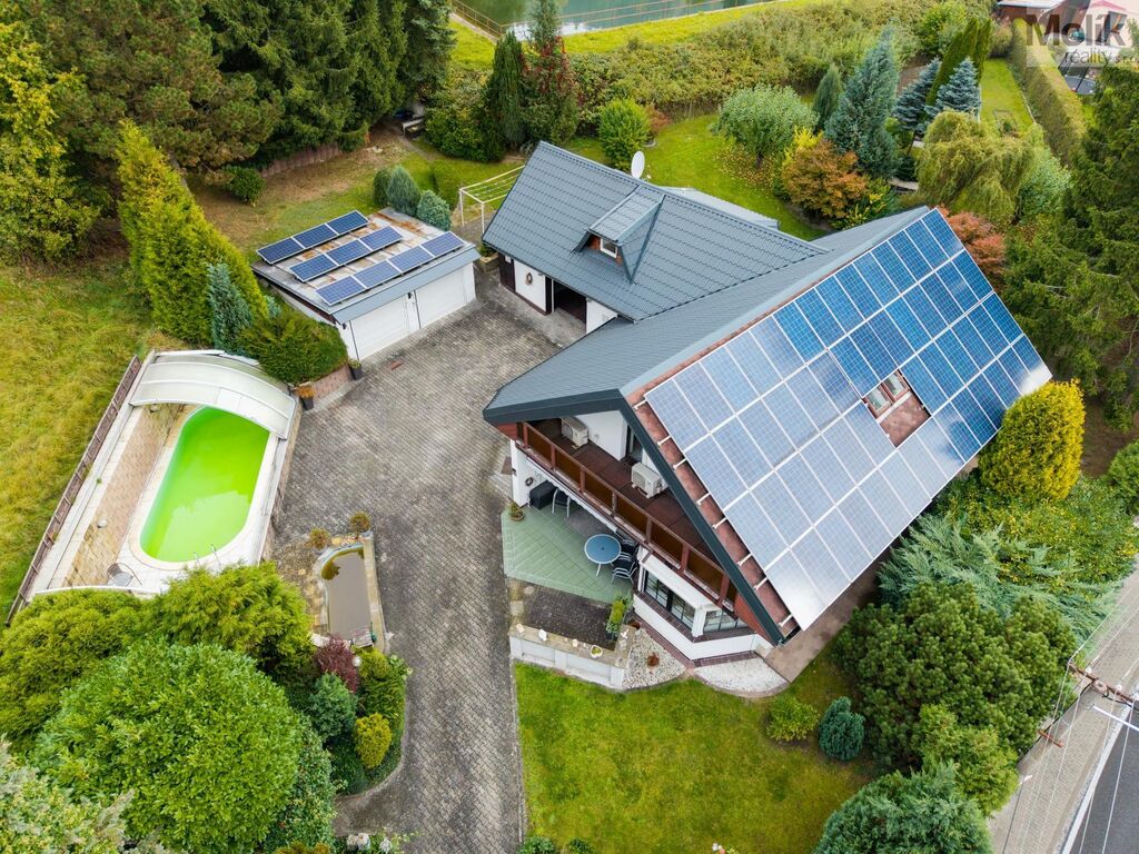 Na pozemku se dále nachází zastřešený bazén, který je napájen solárními panely umístěnými na garážích.