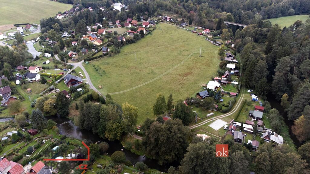 Na jedné straně pozemku teče malebná říčka, na druhé se rozprostírá krásná louka s výhledem do zeleně – ideální prostředí pro klidné bydlení nebo rekreační dům.