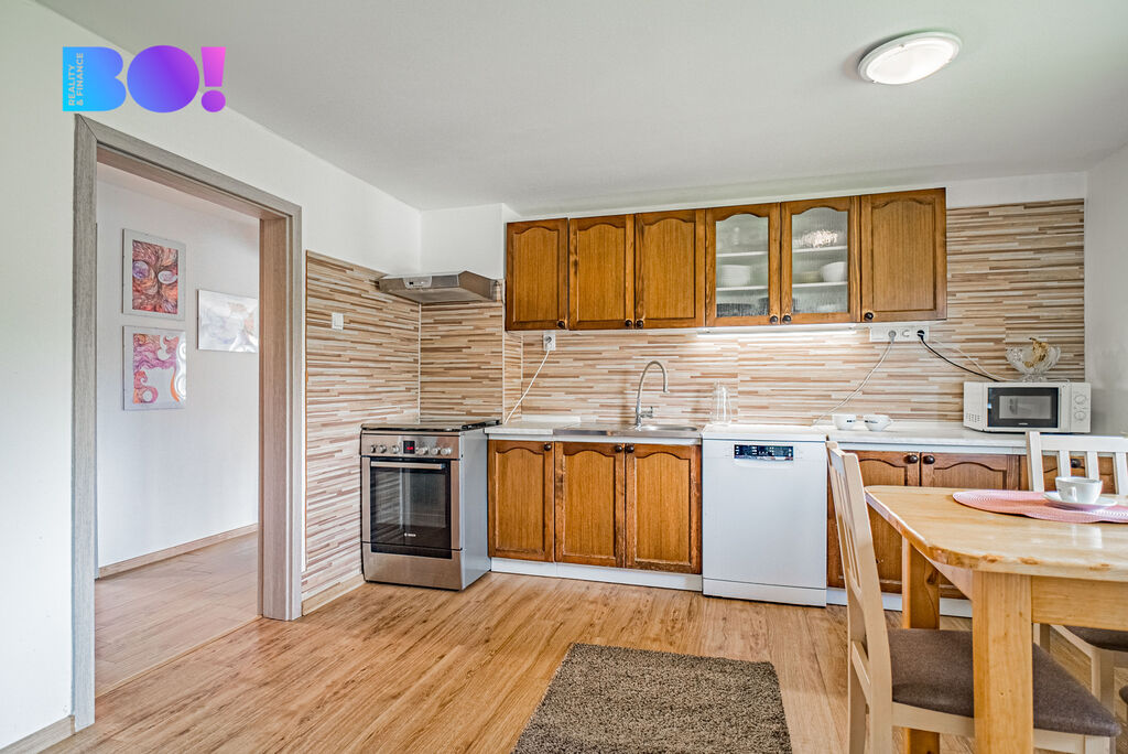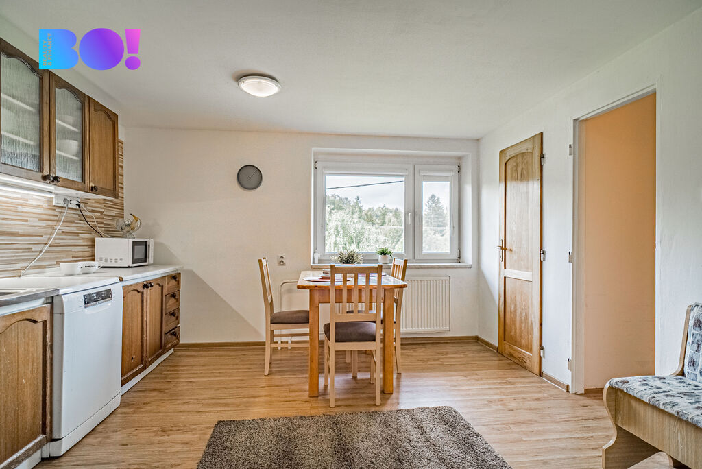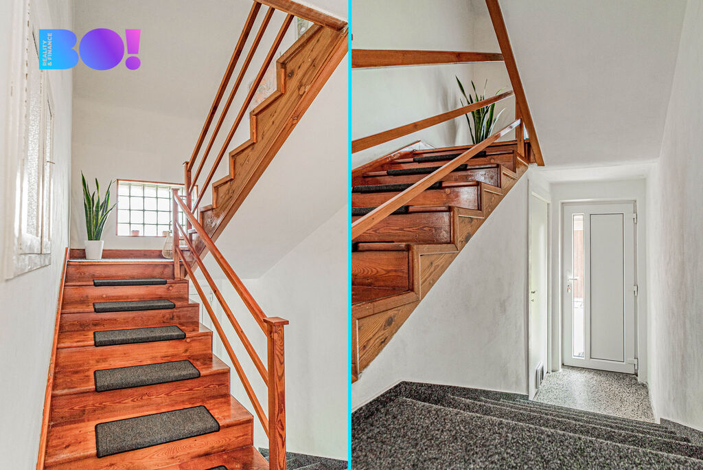 Dvě plnohodnotná podlaží přirozeně rozdělují dům na dva prostorné byty. Každé patro má tři pokoje, samostatnou kuchyni a koupelnu s toaletou. Současná dispozice nabízí pohodlné bydlení bez nutnosti okamžitých úprav, přesto skýtá mnoho možností pro přetvoření podle vašich představ.