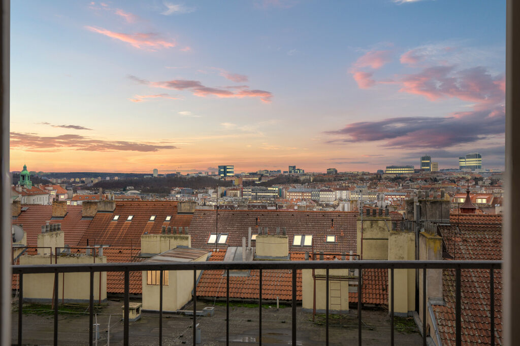 Z balkonu se nabízí úchvatný panoramatický výhled na celou Prahu, který je jedinečným bonusem této nemovitosti.