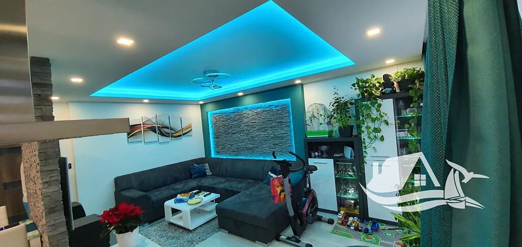 Interiér bytu je navržen s citem pro detail a odolnost materiálů, v kuchyni i koupelně najdete luxusní obklady a sanitu, v obývacím pokoji a ložnicích kvalitní vinylovou podlahu, která si zachovává vzhled dřeva a přitom vydrží každodenní provoz.
