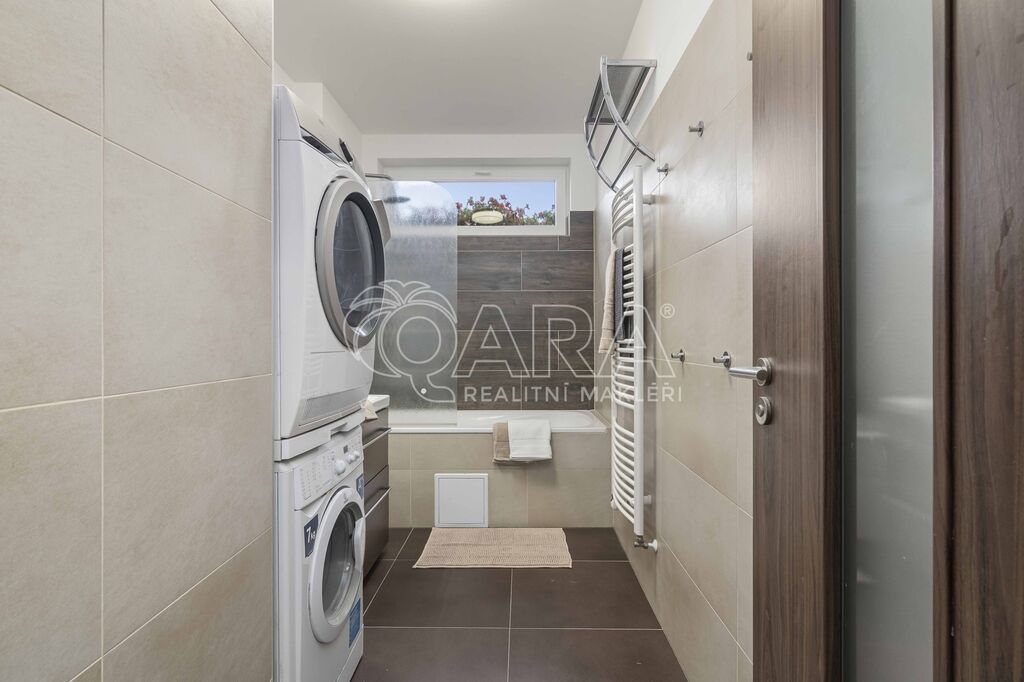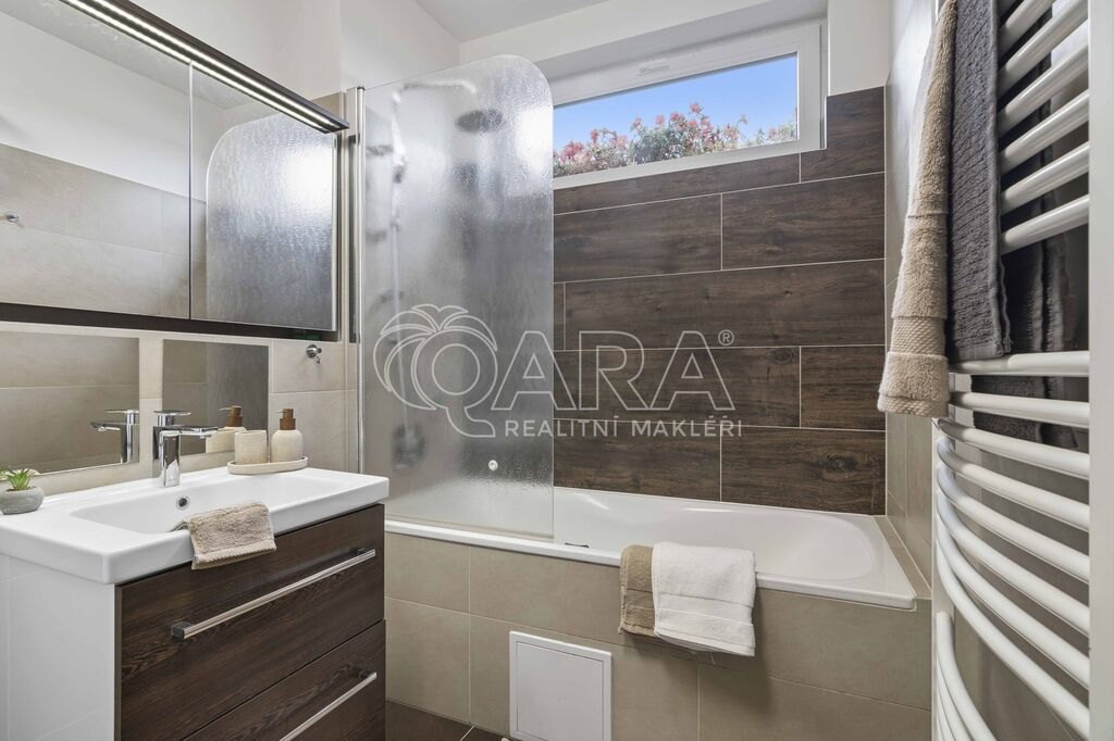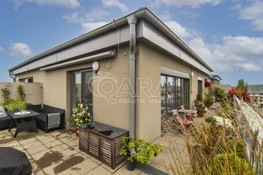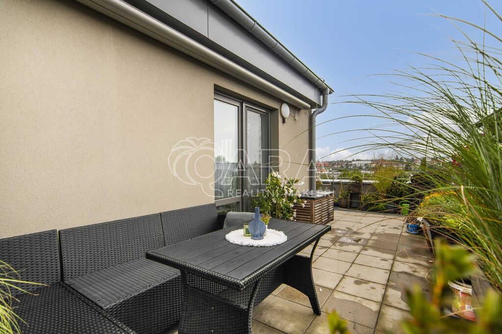 Highlightem tohoto bytu je terasa, která v rámci Horoměřic těžko bude hledat konkurenci. Má výměru 49,8 m2, dálkově ovládanou výsuvnou markýzu, může se pyšnit naprostým soukromím, klidem či výhledy do okolí. Bonusem navíc je pak přímý výhled na dětské hřiště, kam můžete děti vypustit a přitom je mít pod kontrolou.