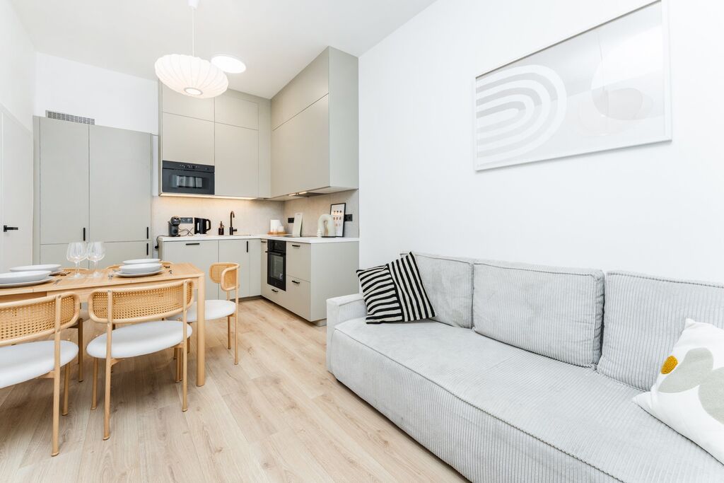 - světlý obývací pokoj s kuchyňským koutem