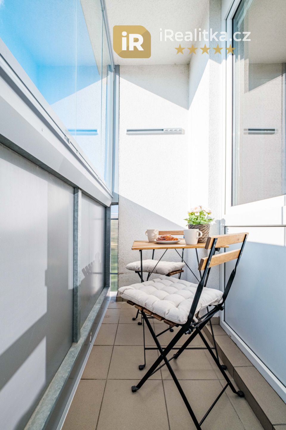 Francouzským oknem pak vstoupíme na zasklenou lodžii (2.8 m2), která vám nabídne krásný výhled a která je stejně jako celý byt orientována na západ. V designové koupelně pak nalezneme umyvadlo, sprchový kout, toaletu a topný žebřík.