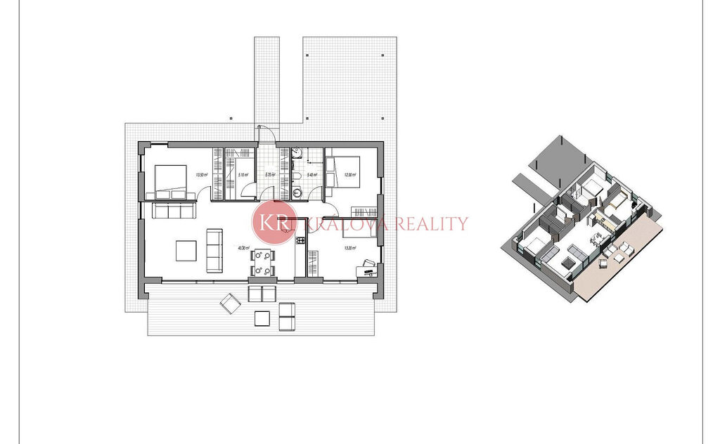 Dům má podlahovou plochu 85,2 metrů čtverečních, rozloženou na jednom patře. Dispozice je 4+kk. Tato velikost je ideální pro malé až středně velké bydlení.