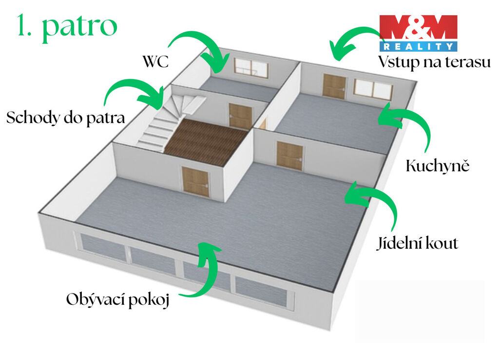 Tento řadový dům s užitnou plochou 138 m² se rozkládá na třech nadzemních podlažích a nabízí celkem 5 místností. V 1. patře -vstupní hala, garáž, kotelna, sklep, dílna, ve 2. patře - kuchyně a velký obývací pokoj s jídelnou, toaleta a ve 3. patře - tři pokoje a koupelna.