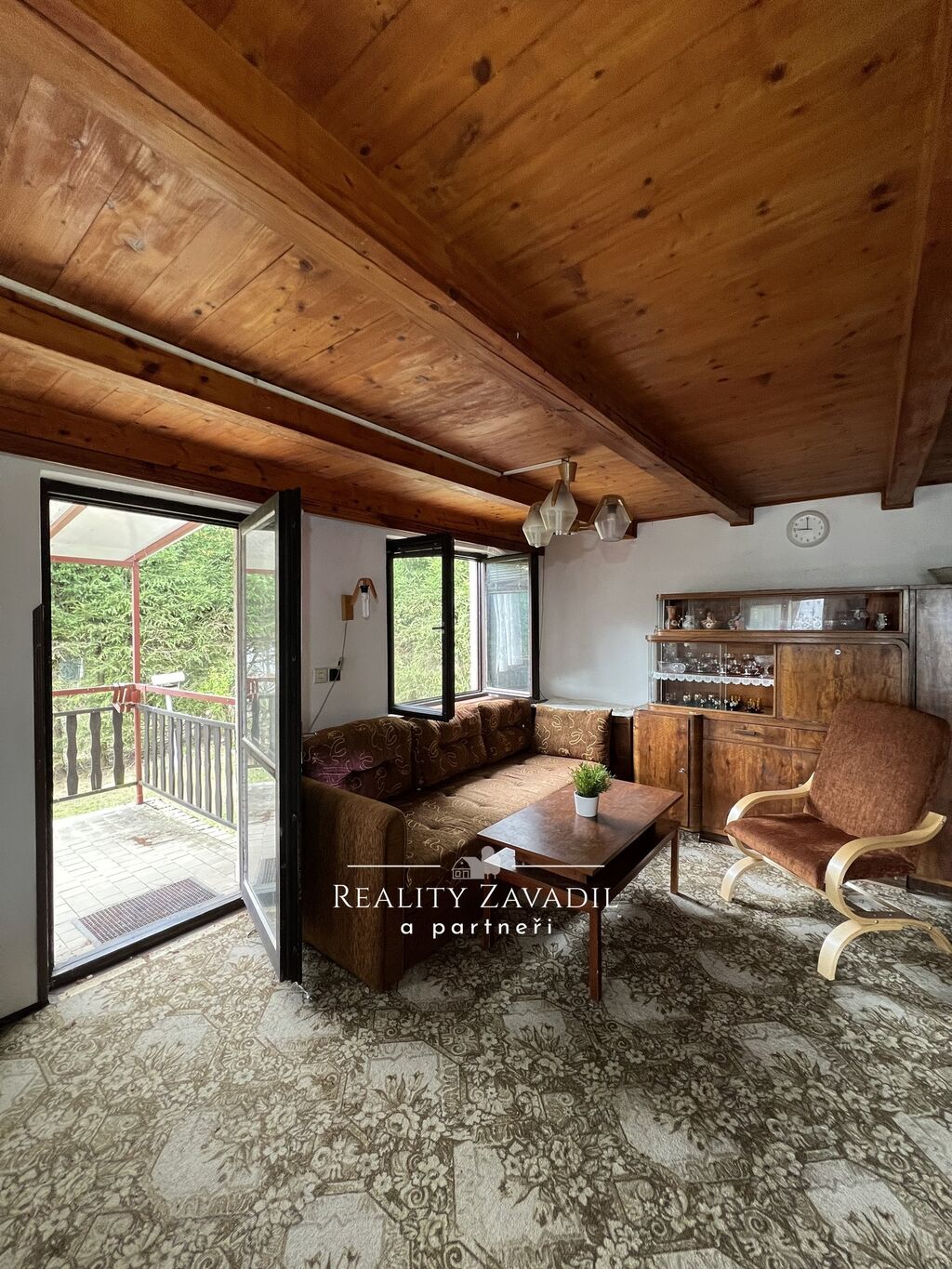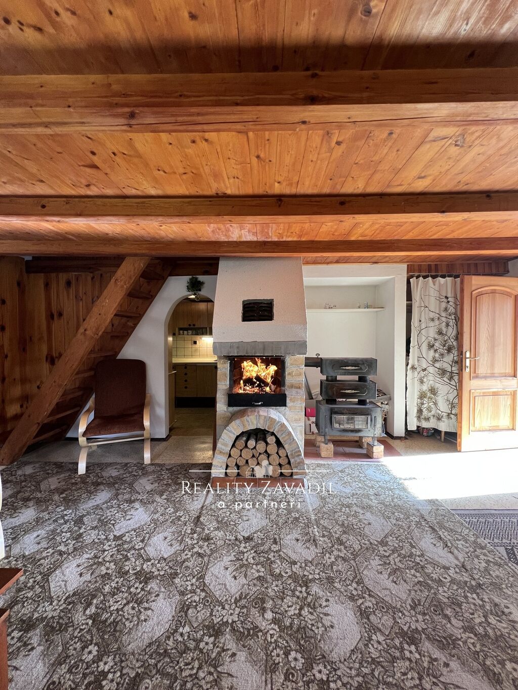 Po schodišti se dostanete do zvýšeného přízemí domu, kde se nachází prosklená veranda, s výhledem do zahrady. Z verandy je vstup na toaletu a do obytné části domu, která disponuje dominantním kamenným krbem, jídelním stolem a obývací částí se vstupem na zastřešenou terasu. Z obývacího pokoje vejdete dále do kuchyně a koupelny, kde je umístěn bojler na ohřev vody, umyvadlo a sprchový kout.