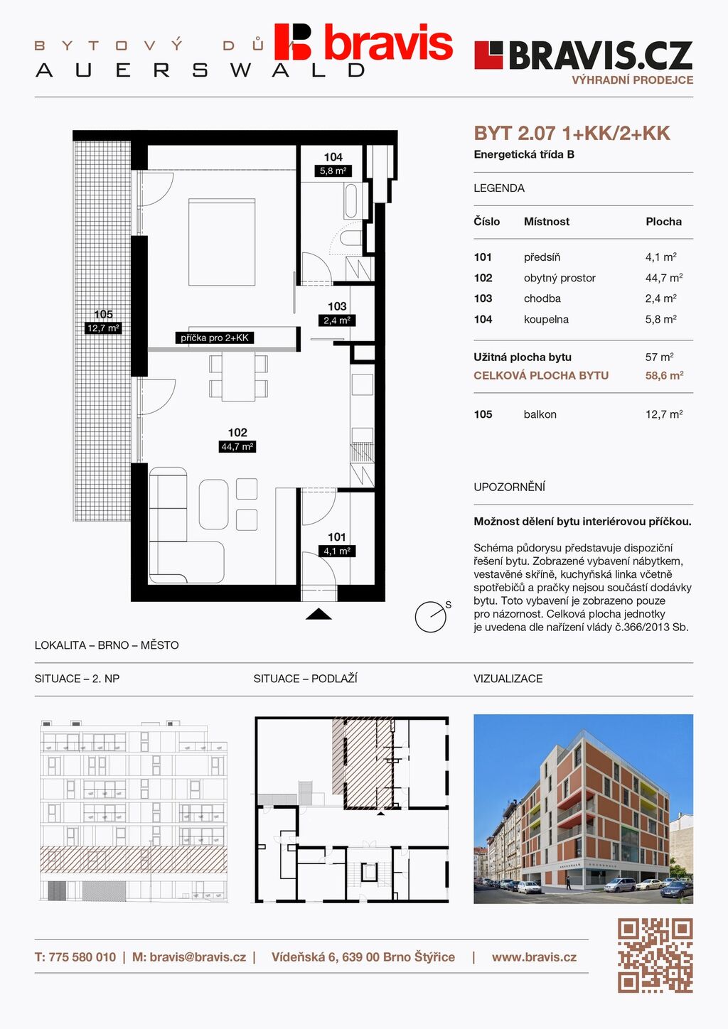 Jedinečnou příležitost Vám nabízí poslední volný byt č. 207 s dispozicí 2+kk o užitné ploše 59 m2, kdy si sami můžete zvolit, kde chcete udělat příčku. Byt s velmi prostornou terasou o velikosti 13 m2 je situovaný do klidného vnitrobloku a je umístěn ve druhém nadzemním podlaží bytového domu s výtahem. Byt je řešen velmi prakticky a účelně pro pohodlné bydlení.