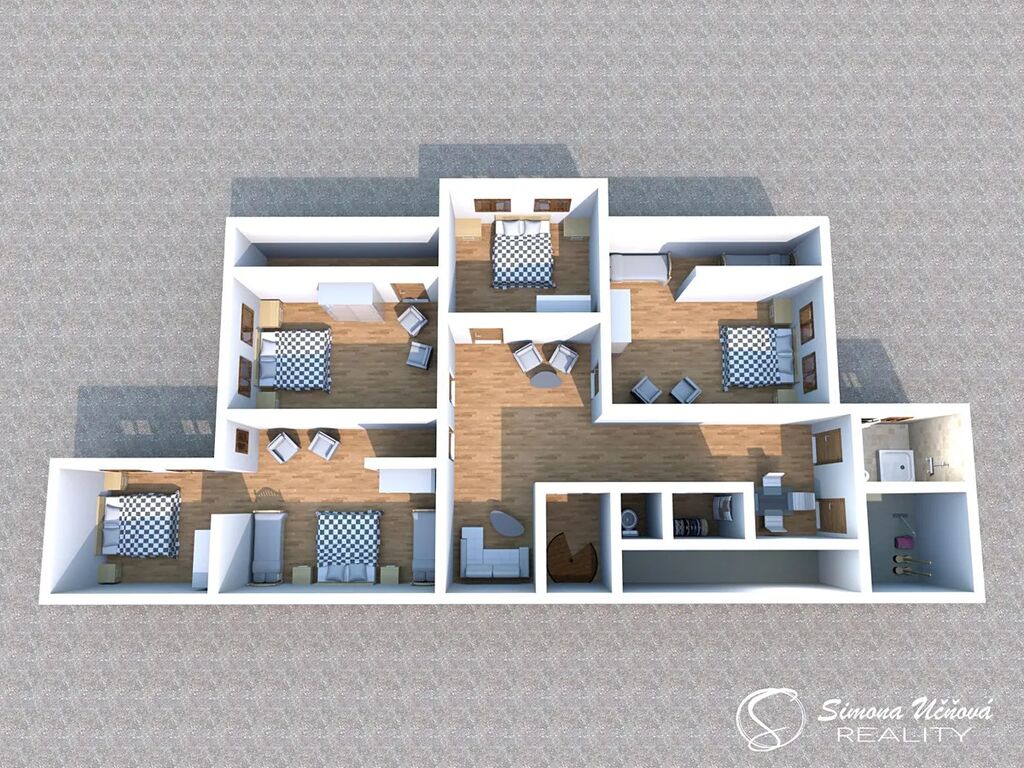 V patře se nachází chodba, 5 pokojů, koupelna, wc a několik skladových a úložných prostor.