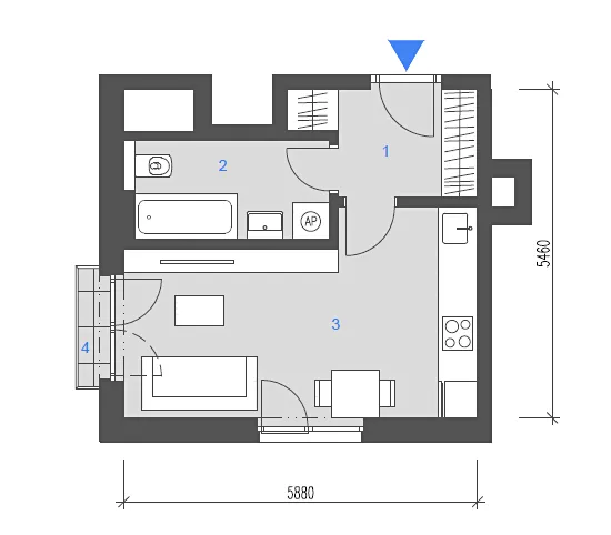 Byt se skládá z předsíně, koupelny s toaletou a obývacího pokoje spojeného s kuchyní, která je vyrobena z kvalitních materiálů a vybavena novou mikrovlnnou troubou, pečicí troubou a indukční varnou deskou. Byt má balkon a také sklep v suterénu o ploše 2,8 m².