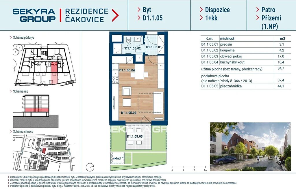 Dovolujeme si Vám nabídnout k prodeji byt 1+kk o výměře 34,7 m² s předzahrádkou 44,10 m² v rezidenčním projektu Rezidence Čakovice, etapa B.