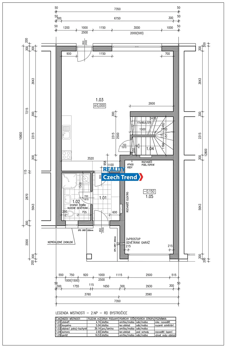 Hledáte klid a komfort? Nabízíme Vám k pronájmu zcela nový moderní řadový rodinný dům 4+kk s garáží a venkovním parkovacím stáním pro jedno až dvě auta v rámci developerského projektu v obci Bystročice nedaleko Olomouce. Velmi nízké nájemné je nižší, než nájemné srovnatelně velkého bytu s garáží v Olomouci. Měsíční zálohy na elektřinu vč. topení jsou cca 4.000,- Kč, na vodu cca 1.000,- Kč. Celková velikost pozemku k domu je včetně zastavěné plochy 351 m². Dům je postaven z cihel Porotherm, okna trojskla zn. Schüco, značkové armatury Hansgrohe. V přízemí domu je vstupní chodba, koupelna se sprchovým koutem, umyvadlem, toaletou a přípojkou na pračku, technická místnost s tepelným čerpadlem o výkonu 8 kW, značky Nibe F 2040-8 + VVM 225 s bojlerem o obsahu 180 l, kuchyňský kout s kuchyňskou linkou s vestavnými nerezovými spotřebiči a přípravou na myčku, obývací pokoj s francouzským oknem a vstupem na částečně zastřešenou terasu a bezúdržbovou zahradu, schodiště do patra. V patře domu jsou tři ložnice, šatna a koupelna s vanou, umyvadlem, toaletou, bidetem a přípojkou na pračku. V celém domě včetně garáže je na podlaze dlažba s teplovodním podlahovým vytápěním. Dům je připojen na optický kabel, rozvody internetu a TV signálu jsou v každém pokoji.