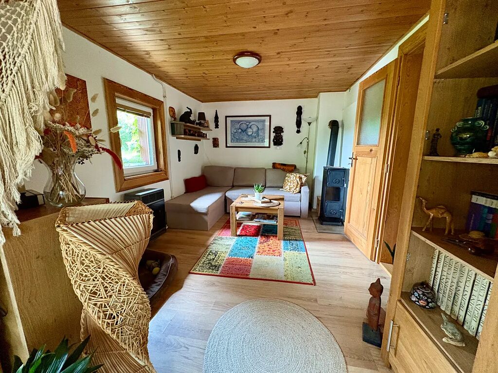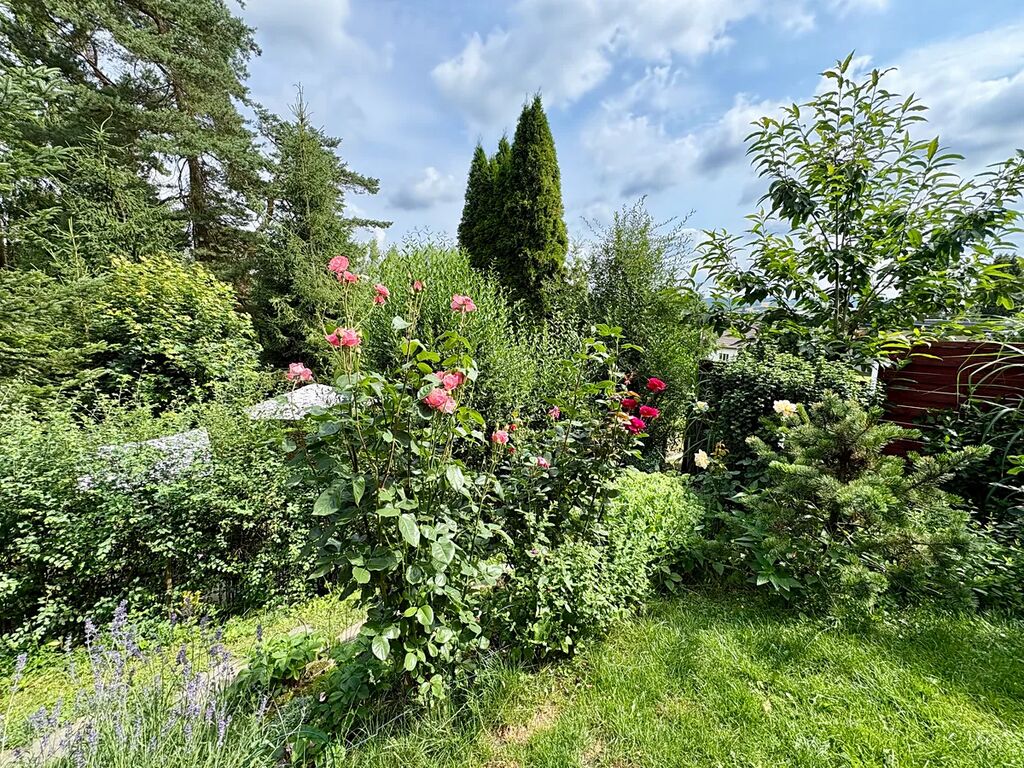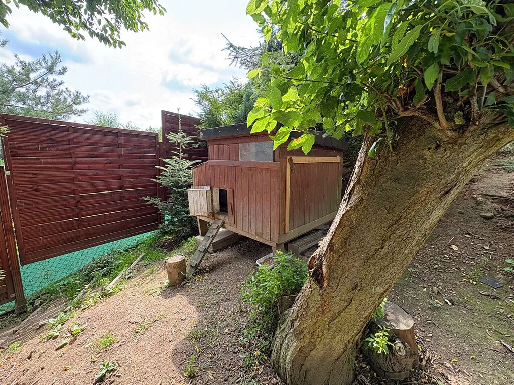 Udržovaná terasovitá zahrada, která chatu obklopuje poskytuje dostatečné soukromí a má řadu romantických zákoutí k posezení, lenošení nebo kochání se rozkvetlými záhony. Najdete zde jak okrasné tak užitkové rostliny a vzrostlé stromy a je zde i oddělený výběh pro slepice s kurníkem. Je zde také studna a nádrž na dešťovou vodu využívaná k zalévání zahrady. Součástí dvora je dřevěná kůlna s koupelnou, která může sloužit jako ateliér nebo dílna. Chata je vzhledem k velikosti vhodná pro 1-2 obyvatele. Nahlášení trvalého bydliště je zde možné, stejně jako financování hypotékou.