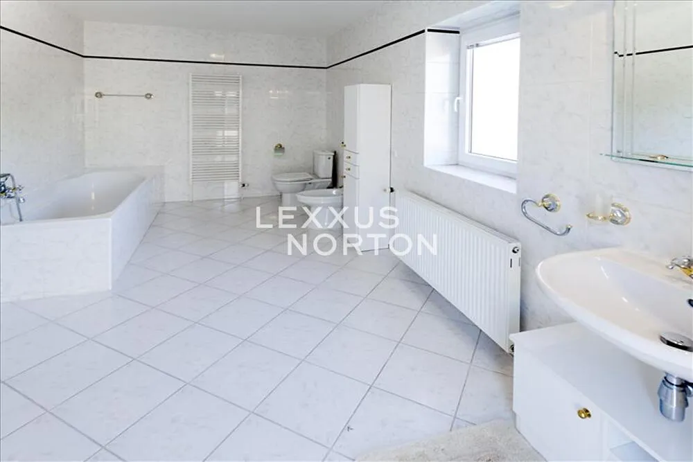 Dvoupatrový dům dispozičně nabízí k užívání vstupní halu, velkorysý obývací pokoj, plně vybavenou kuchyň (sklokeramická deska, trouba, lednice, mrazák a myčka nádobí), jídelnu, 4 ložnice,2 koupelny (vana, sprchový kout, toaleta a bidet), samostatnou toaletu, šatnu, fitness, prádelnu a kotelnu. K bytu náleží zahrada s dvěma terasami a garáž pro 2 vozy.