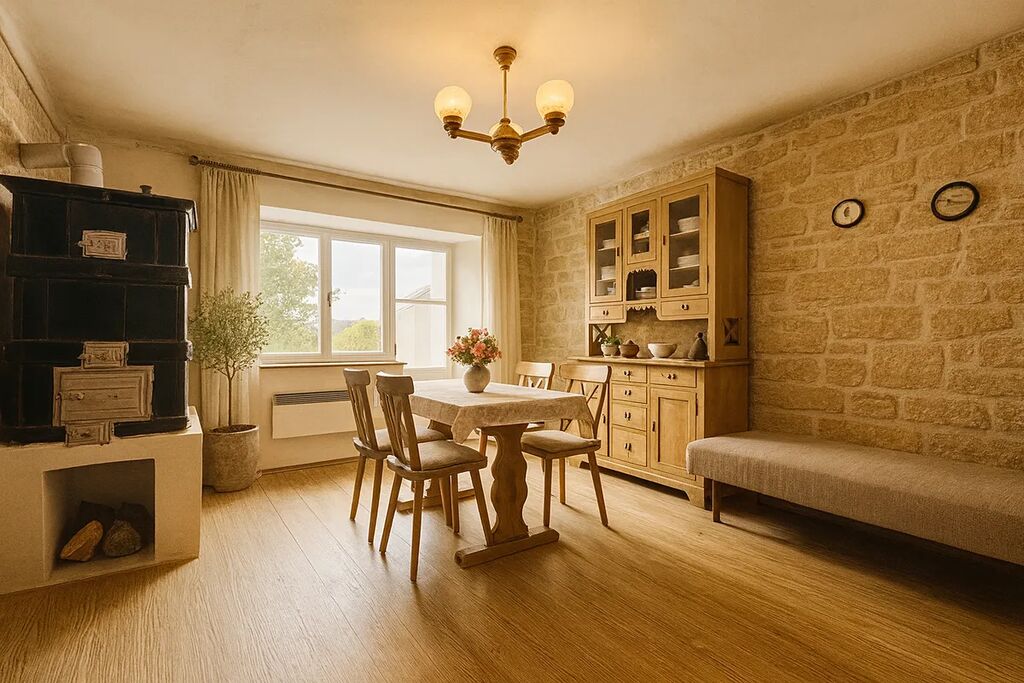 Srdcem celého domu jsou původní keramická kamna v obývacím pokoji a dvojkamna v kuchyni. Dříve se v nich nejen topilo, ale také vařilo a peklo. I dnes dokážou vykouzlit tu pravou rodinnou atmosféru – představte si, jak v zimních večerech praská oheň a celým domem se line vůně čerstvě upečených buchet. Revize komína proběhla před dvěma lety, takže jejich užívání je bezproblémové a bezpečné.
