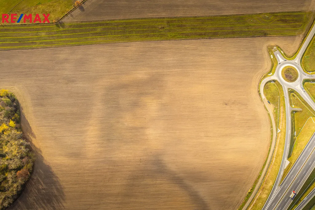 Pozemek má lichoběžníkový tvar, výbornou dopravní dostupnost a přímou viditelnost z dálnice – ideální poloha pro developerský projekt komerčního využití.