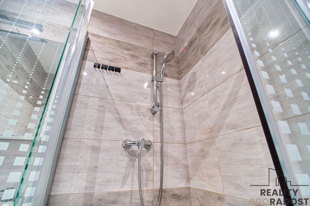• Koupelna s WC po kompletní rekonstrukci – sprchový kout, umyvadlo se zrcadlem, moderní keramické obklady v přírodních tónech.