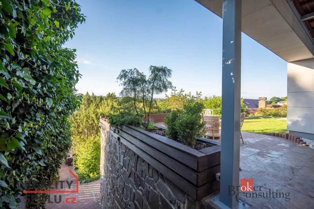 Dům má podlahovou plochu téměř 200m2 a k tomu 2 garáže. Stojí na svažitém, upraveném pozemku (723 m²) se vzrostlými stromy a na konci slepé ulice Za Mototechnou. Díky tomu, že dům stojí v horní části pozemku (nad garáží), máte úžasné výhledy jak z přízemí, kde je velká terasa a část zahrady, tak samozřejmě i v prvním patře domu.