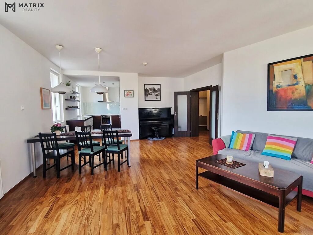 Byt je součástí moderní nástavby rohového domu, jen pár minut chůze od Olšanského náměstí a náměstí Jiřího z Poděbrad.