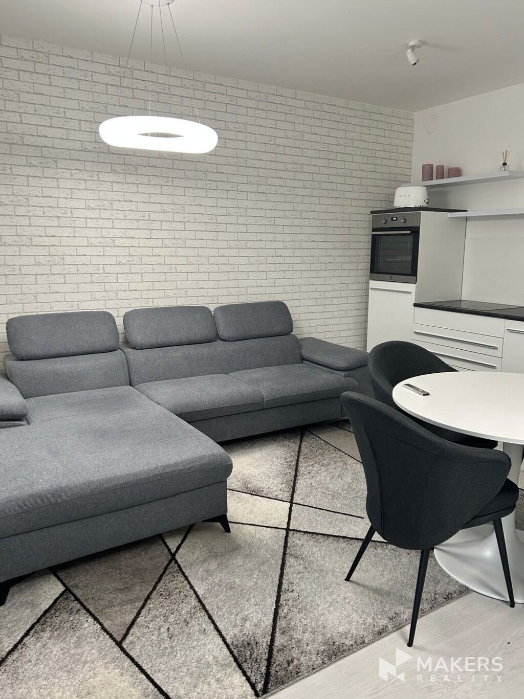 Interiér bytu je promyšleně řešený a nabízí vše potřebné pro pohodlné bydlení. Otevřený obytný prostor je vybaven moderní kuchyňskou linkou se spotřebiči – elektrickou troubou, myčkou, varnou deskou, lednicí, rychlovarnou konvicí. Součástí je také jídelní kout se stolem a čtyřmi židlemi, pohodlná rohová rozkládací sedačka, televize a stylový elektrický krb, který interiéru dodává útulnou atmosféru.