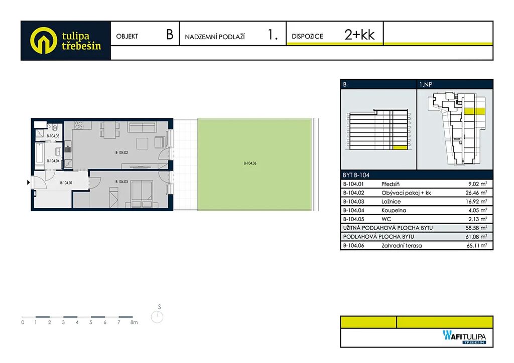 Podlahová plocha bytu: 61,08 m²; zahradní terasa: 65 m²; sklep: 3,4 m²; parkovací stání: 2. PP v podzemní garáži.